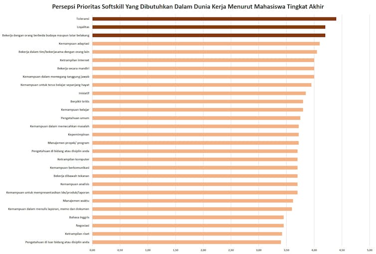 Studi yang kami lakukan menawarkan beberapa indikator kompetensi non-teknis (soft skill) kepada 100 responden Gen Z. Kami meminta mereka menentukan mana yang menjadi prioritas.
